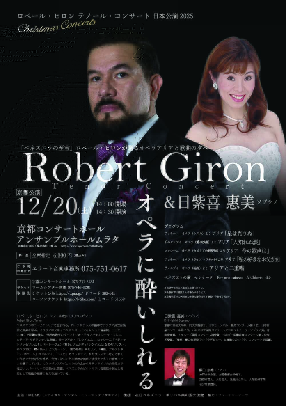 国際的に活躍するベネズエラのテノール歌手による、待望の日本公演が実現します。 イタリア、スペイン、オーストリア、コロンビアなど世界各国で絶賛を博した美しい歌声を、 日本の皆様にお届けいたします。
